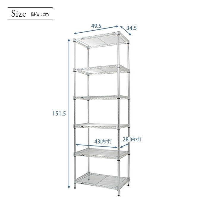 商品仕様 商品シリーズ [19mm] ルミナスライト ホームラック 幅50 6段 幅49.5×奥行34.5×高さ151.5cm 外形寸法 幅49.5×奥行34.5×高さ151.5cm シェルフ内寸 幅43×奥行28cm ポール分割サイズ [上部]75.5cm [下部]76cm 耐荷重 棚板(1枚あたり):150kg全体/アジャスター装着時:500kg 内容明細 棚板(幅50×奥35cm)×6枚スリーブ×24組ポール(約151.5cm)×4本アジャスター×4個 ※キャスターは別売りです。