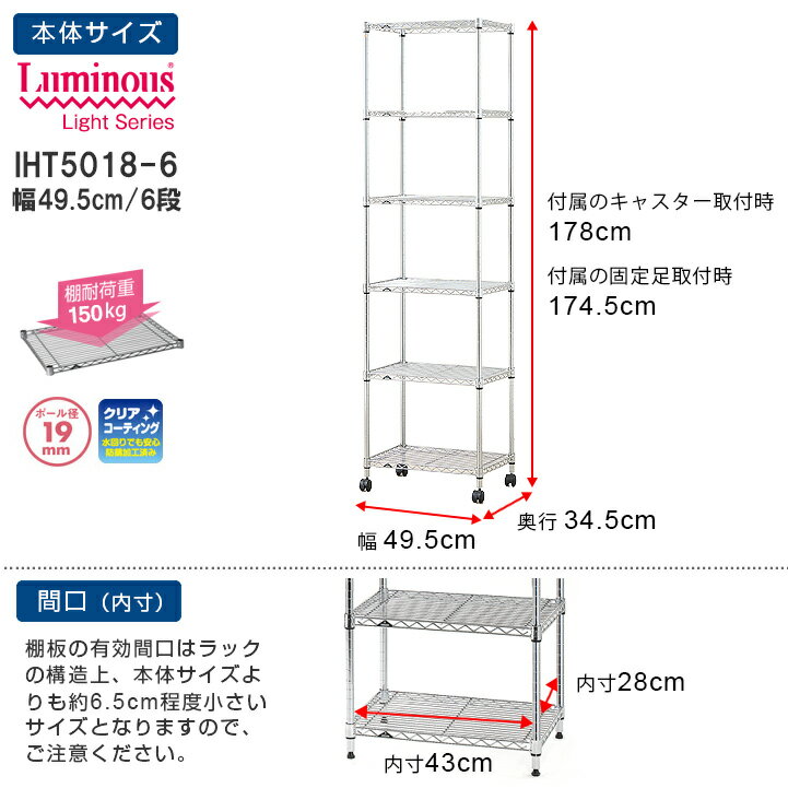 商品スペック 商品名/型番 ルミナスライト フリーラック 6段 幅50cmモデル IHT5018-6 カテゴリ ポール径19mm ルミナス 分 類 スチールラック セット品 外寸サイズ(約) 幅49.5×奥行34.5×高さ174.5cm 固定足の場合:高さ(約)174.5cm キャスターの場合:高さ(約)178cm 棚板サイズ 幅49.5×奥行34.5cm (内寸:幅43×奥行28cm) 設置サイズ(約) 幅49.5×奥行34.5cm 耐荷重 棚板1枚:150kg ラック全体耐荷重:400kg JANコード /アイテムコード 4549387967156 コーティング/塗装 クリアコーティング(防錆加工仕上げ) 素 材 本体:スチール、スリーブ(取付部品):ABS樹脂 セット内容・付属品 シェルフ(棚板)×6枚 ポール(約 174.5cm)×4本 スリーブ(取付部品)×24組アジャスター(固定脚)×4個 ポール分割 ポール分割サイズ(約):[上部]85.5cm [下部]87cm ※120cm以上のポールに関しましては、2本に分割した状態でのお届けとなります。