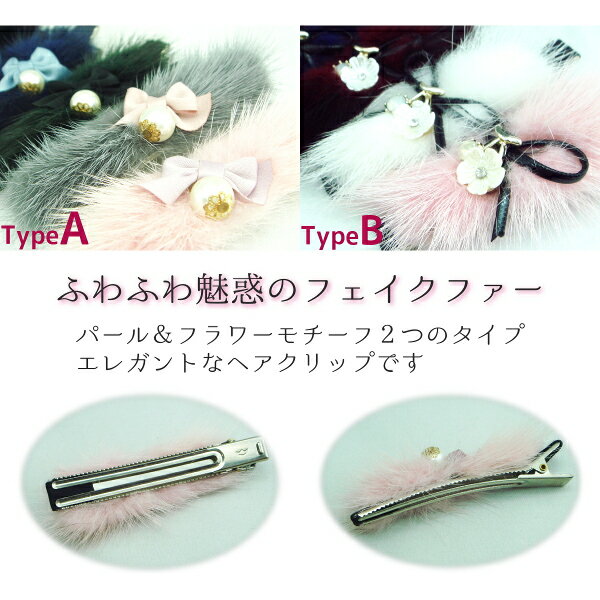 リボン付きファーのヘアクリップ☆ヘアアクセサリー ヘアーアクセサリー ファー ラインストーン パール フラワー ふわふわ ホワイト ピンク ワイン レッド 赤 ネイビー 紺色 グリーン 緑 グレー ブラック 黒 プレゼント ギフト メロウストア【メール便配送】