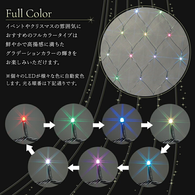 豊富なカラーバリエーション ------------------------------------------------------------ イベントやクリスマスの雰囲気におすすめのフルカラータイプは鮮やかで高揚感に満ちたグラデーションカラーの輝きをお楽しみいただけます。